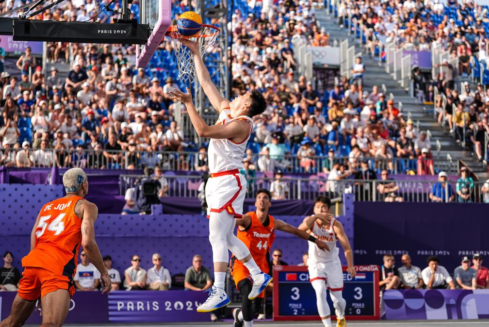 2024年7月30日,中國(guó)隊(duì)球員張寧(上)在巴黎奧運(yùn)會(huì)三人籃球男子分組循環(huán)賽中上籃。新華社記者 朱崢 攝