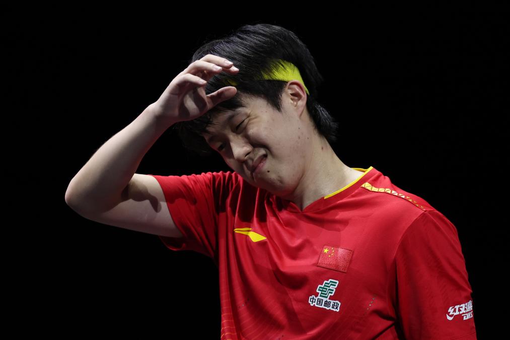 男單決賽在中國選手王楚欽和日本選手張本智和之間進(jìn)行。圖為王楚欽在比賽中失分后。新華社記者 賈浩成 攝