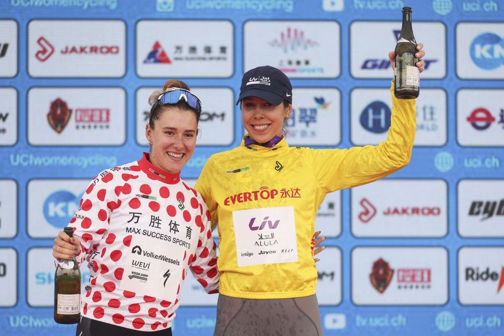 10月14日,身著代表爬坡總積分第一名的圓點(diǎn)衫的安妮·克妮珍寶(左)和身著代表個(gè)人總成績(jī)第一名的黃衫的貝克在頒獎(jiǎng)儀式上慶祝。新華社記者 王翔 攝