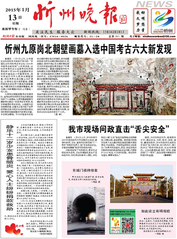 2015年1月9日上午,從中國社會科學院學術報告廳舉行的“中國社會科學院考古學論壇·2014年中國考古新發(fā)現(xiàn)”上傳來消息,論壇評審委員會從全國考古機構推薦的數(shù)十項2014年全國最新考古發(fā)現(xiàn)中遴選出六項重要發(fā)現(xiàn),其中忻州市九原崗北朝壁畫墓,同甘肅肅北縣馬鬃山玉礦遺址、云南祥云縣大波那墓地、西藏阿里地區(qū)故如甲木墓地和曲踏墓地、內(nèi)蒙古陳巴爾虎旗崗嘎墓地、貴州遵義市新蒲播州楊氏土司墓地一同入選。