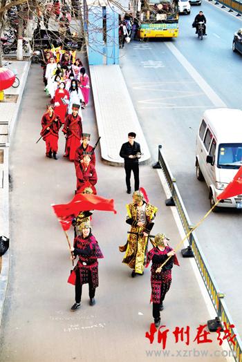 男的身披戰(zhàn)袍鎧甲,女的一襲古裝長裙,一支戰(zhàn)國時代的隊伍揮舞旗幟、佩帶長劍從忻州城區(qū)七一路走過?!笆遣皇桥碾娨晞×耍俊边^往行人紛紛側(cè)目觀望。