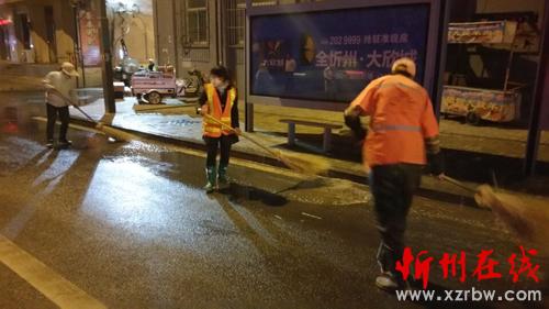 寂靜的夜晚伴隨著酒水車的轟鳴聲一股股清澈的水流噴灑在馬路上,街頭沉現(xiàn)著一個(gè)個(gè)揮舞著掃帚的橙黃色身影,點(diǎn)綴的忻州城區(qū)的夜色更加靚麗。