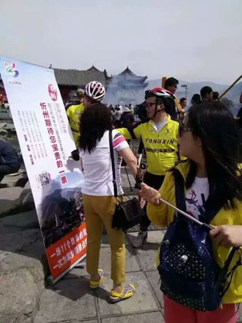 5月19日,在第六個“中國旅游日”,共青團五臺縣委組織20余名青年騎行愛好者,騎著單車來到五臺山核心景區(qū),拉起宣傳畫,耐心向來山游客講解投票方法,動員廣大游客為忻州申辦山西旅游發(fā)展大會投下寶貴一票。(劉力強 攝)