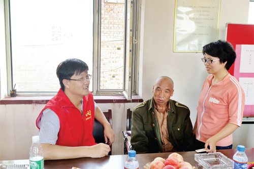 愛心人士代表朱玉堂與宿香玲及其父交談