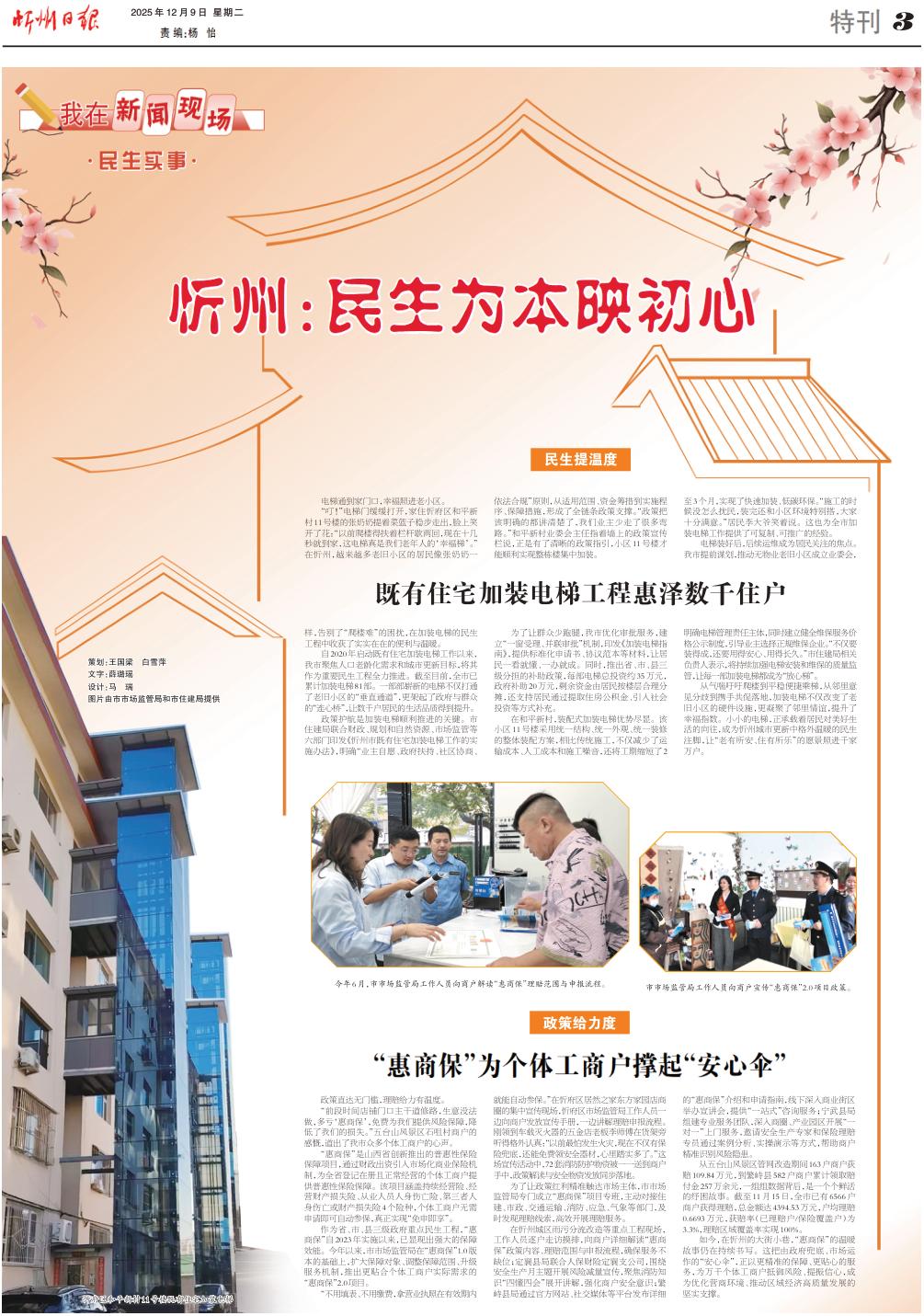 市市場(chǎng)監(jiān)管局工作人員向商戶宣傳“惠商保”2.0項(xiàng)目政策。 民生提溫度 既有住宅加裝電梯工程惠澤數(shù)千住戶 電梯通到家門口,幸福照進(jìn)老小區(qū)。 “叮!”電梯門緩緩打開,家住忻府區(qū)和平新村11號(hào)樓的張奶奶提著菜籃子穩(wěn)步走出,臉上笑開了花:“以前爬樓得扶著欄桿歇兩回,現(xiàn)在十幾秒就到家,這電梯真是我們老年人的‘幸福梯’?!痹谛弥荩絹碓蕉嗬吓f小區(qū)的居民像張奶奶一樣,告別了“爬樓難”的困擾,在加裝電梯的民生工程中收獲了實(shí)實(shí)在在的便利與溫暖。 自2020年啟動(dòng)既有住宅加裝電梯工作以來,我市聚焦人口老齡化需求和城市更新目標(biāo),將其作為重要民生工程全力推進(jìn)。截至目前,全市已累計(jì)加裝電梯81部。一部部嶄新的電梯不僅打通了老舊小區(qū)的“垂直通道”,更架起了政府與群眾的“連心橋”,讓數(shù)千戶居民的生活品質(zhì)得到提升。 政策護(hù)航是加裝電梯順利推進(jìn)的關(guān)鍵。市住建局聯(lián)合財(cái)政、規(guī)劃和自然資源、市場(chǎng)監(jiān)管等六部門印發(fā)《忻州市既有住宅加裝電梯工作的實(shí)施辦法》,明確“業(yè)主自愿、政府扶持、社區(qū)協(xié)商、依法合規(guī)”原則,從適用范圍、資金籌措到實(shí)施程序、保障措施,形成了全鏈條政策支撐。“政策把該明確的都講清楚了,我們業(yè)主少走了很多彎路?!焙推叫麓鍢I(yè)委會(huì)主任指著墻上的政策宣傳欄說,正是有了清晰的政策指引,小區(qū)11號(hào)樓才能順利實(shí)現(xiàn)整棟樓集中加裝。 為了讓群眾少跑腿,我市優(yōu)化審批服務(wù),建立“一窗受理、并聯(lián)審批”機(jī)制,印發(fā)《加裝電梯指南》,提供標(biāo)準(zhǔn)化申請(qǐng)書、協(xié)議范本等材料,讓居民一看就懂、一辦就成。同時(shí),推出省、市、縣三級(jí)分擔(dān)的補(bǔ)助政策,每部電梯總投資約35萬元,政府補(bǔ)助20萬元,剩余資金由居民按樓層合理分?jǐn)?,還支持居民通過提取住房公積金、引入社會(huì)投資等方式補(bǔ)充。 在和平新村,裝配式加裝電梯優(yōu)勢(shì)盡顯。該小區(qū)11號(hào)樓采用統(tǒng)一結(jié)構(gòu)、統(tǒng)一外觀、統(tǒng)一裝修的整體裝配方案,相比傳統(tǒng)施工,不僅減少了運(yùn)輸成本、人工成本和施工噪音,還將工期縮短了2至3個(gè)月,實(shí)現(xiàn)了快速加裝、低碳環(huán)保?!笆┕さ臅r(shí)候沒怎么擾民,裝完還和小區(qū)環(huán)境特別搭,大家十分滿意?!本用窭畲鬆斝χf。這也為全市加裝電梯工作提供了可復(fù)制、可推廣的經(jīng)驗(yàn)。 電梯裝好后,后續(xù)運(yùn)維成為居民關(guān)注的焦點(diǎn)。我市提前謀劃,推動(dòng)無物業(yè)老舊小區(qū)成立業(yè)委會(huì),明確電梯管理責(zé)任主體,同時(shí)建立健全維保服務(wù)價(jià)格公示制度,引導(dǎo)業(yè)主選擇正規(guī)維保企業(yè)?!安粌H要裝得成,還要用得安心、用得長(zhǎng)久。”市住建局相關(guān)負(fù)責(zé)人表示,將持續(xù)加強(qiáng)電梯安裝和維保的質(zhì)量監(jiān)管,讓每一部加裝電梯都成為“放心梯”。 從氣喘吁吁爬樓到平穩(wěn)便捷乘梯,從鄰里意見分歧到攜手共促落地,加裝電梯不僅改變了老舊小區(qū)的硬件設(shè)施,更凝聚了鄰里情誼,提升了幸福指數(shù)。小小的電梯,正承載著居民對(duì)美好生活的向往,成為忻州城市更新中格外溫暖的民生注腳,讓“老有所安、住有所樂”的愿景照進(jìn)千家萬戶。 政策給力度 “惠商?!睘閭€(gè)體工商戶撐起“安心傘” 政策直達(dá)無門檻,理賠給力有溫度。 “前段時(shí)間店鋪門口主干道修路,生意沒法做,多虧‘惠商?!?,免費(fèi)為我們提供風(fēng)險(xiǎn)保障,降低了我們的損失?!蔽迮_(tái)山風(fēng)景區(qū)石咀村商戶的感慨,道出了我市眾多個(gè)體工商戶的心聲。 “惠商保”是山西省創(chuàng)新推出的普惠性保險(xiǎn)保障項(xiàng)目,通過財(cái)政出資引入市場(chǎng)化商業(yè)保險(xiǎn)機(jī)制,為全省登記在冊(cè)且正常經(jīng)營(yíng)的個(gè)體工商戶提供普惠性保險(xiǎn)保障。該項(xiàng)目涵蓋持續(xù)經(jīng)營(yíng)險(xiǎn)、經(jīng)營(yíng)財(cái)產(chǎn)損失險(xiǎn)、從業(yè)人員人身傷亡險(xiǎn)、第三者人身傷亡或財(cái)產(chǎn)損失險(xiǎn)4個(gè)險(xiǎn)種,個(gè)體工商戶無需申請(qǐng)即可自動(dòng)參保,真正實(shí)現(xiàn)“免申即享”。 作為省、市、縣三級(jí)政府重點(diǎn)民生工程,“惠商?!弊?023年實(shí)施以來,已顯現(xiàn)出強(qiáng)大的保障效能。今年以來,市市場(chǎng)監(jiān)管局在“惠商?!?.0版本的基礎(chǔ)上,擴(kuò)大保障對(duì)象、調(diào)整保障范圍、升級(jí)服務(wù)機(jī)制,推出更貼合個(gè)體工商戶實(shí)際需求的“惠商?!?.0項(xiàng)目。 “不用填表、不用繳費(fèi),拿營(yíng)業(yè)執(zhí)照在有效期內(nèi)就能自動(dòng)參保?!痹谛酶畢^(qū)居然之家東方家園店商圈的集中宣傳現(xiàn)場(chǎng),忻府區(qū)市場(chǎng)監(jiān)管局工作人員一邊向商戶發(fā)放宣傳手冊(cè),一邊講解理賠申報(bào)流程。剛領(lǐng)到車載滅火器的五金店老板李師傅在貨架旁聽得格外認(rèn)真:“以前最怕發(fā)生火災(zāi),現(xiàn)在不僅有保險(xiǎn)兜底,還能免費(fèi)領(lǐng)安全