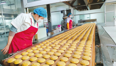 山西鑫炳記食業(yè)股份有限公司生產(chǎn)車(chē)間里,工作人員正在制作太谷餅。孫泰雁攝