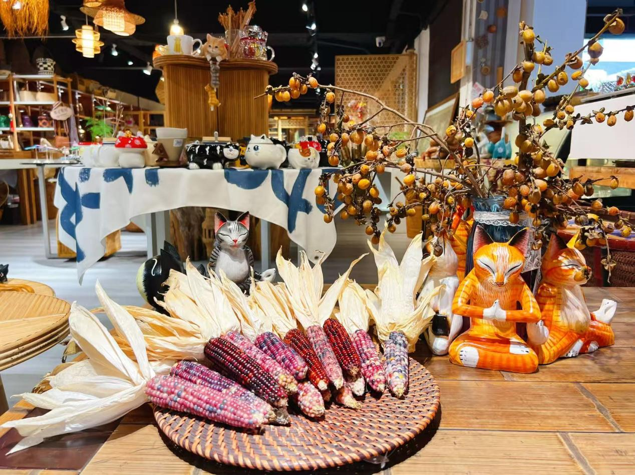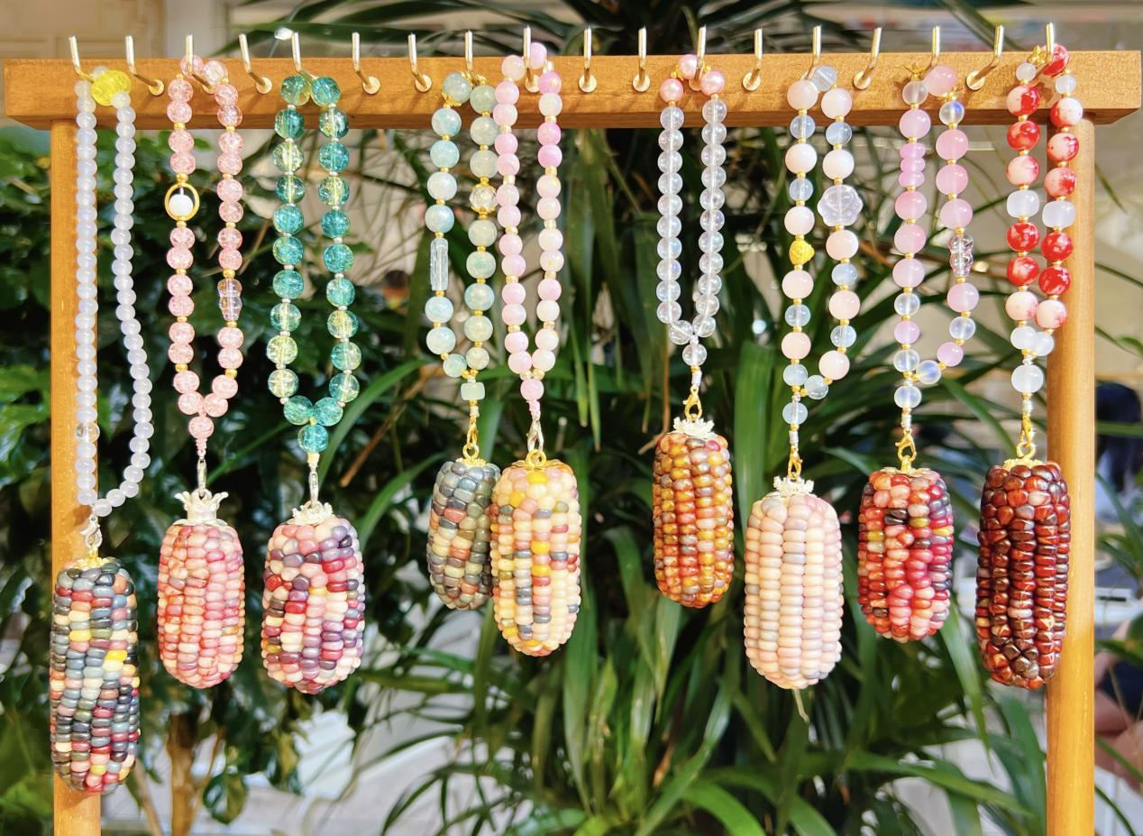 經(jīng)自然晾曬、人工精選、手工創(chuàng)意后,高顏值的玉米迎來(lái)了“七十二變”:配上木質(zhì)底座成為文玩擺件,單粒打孔輔以云南銀飾變成手鏈、鑰匙扣,掛飾、裝飾畫(huà)等。