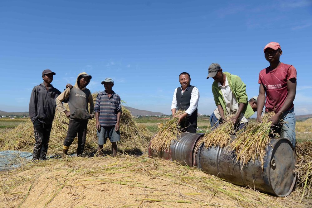 在馬達加斯加首都塔那那利佛附近的馬義奇鎮(zhèn),中國雜交水稻技術(shù)專家胡月舫(右三)在中國國家雜交水稻工程技術(shù)研究中心非洲分中心的試驗田里和當?shù)剞r(nóng)民一起收獲水稻(2023年5月12日攝)。新華社發(fā)(西塔卡·拉喬納里松 攝)
