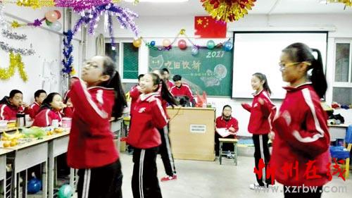 聯歡會由各班學生自己精心組織、排練,并由學生自主開展。同學們熱情高漲,積極參與,充分發(fā)揮自己的特長,表演自己最拿手的節(jié)目。每位同學都積極參與,每個人都成了“明星大腕”。班級聯歡會內容豐富、精彩紛呈,舞蹈、歌曲、相聲、小品、游戲等節(jié)目一一亮相,喜慶祥和的氛圍濃厚強烈。圖為初二210班學生正在進行節(jié)目表演。(郝江峰 攝)