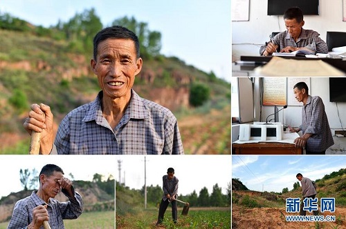 董留照,男,1949年出生,山西省長治市武鄉(xiāng)縣韓道溝村人,現(xiàn)任韓道溝村黨支部書記。近年來,董留照帶領(lǐng)村民大力發(fā)展梅杏種植、家禽養(yǎng)殖,改善村容村貌。2018年,韓道溝村實(shí)現(xiàn)整村脫貧,村民年人均收入達(dá)到4500多元。 左上:董留照肖像;右上:董留照在村委會(huì)整理材料;右中:董留照在村委會(huì)通過廣播向村民宣傳農(nóng)業(yè)政策;右下:董留照在地里松土;下中:董留照在地里忙碌;下左:董留照擦拭額頭上的汗水(拼版照片,6月10日攝)。 地處晉東南的山西省長治市,位于由太行山、太岳山環(huán)繞而成的上黨盆地中。在群山中、崖壁上,許多村莊自然條件惡劣,基礎(chǔ)設(shè)施落后,脫貧致富是大山深處人們的迫切心愿。 近年來,一場場脫貧攻堅(jiān)戰(zhàn),在一個(gè)個(gè)深山村打響。政府全力探索脫貧路徑的同時(shí),山區(qū)百姓因地制宜,靠自己的雙手和智慧走上致富路,交出了一份扎實(shí)的脫貧答卷。 記者在太行山、太岳山一路尋訪,記錄下多位70歲老人的生活。這些共和國的同齡人,親歷了山鄉(xiāng)的巨變,見證著長治山區(qū)脫貧攻堅(jiān)偉大工程的一步步推進(jìn)。 新華社記者 詹彥 攝