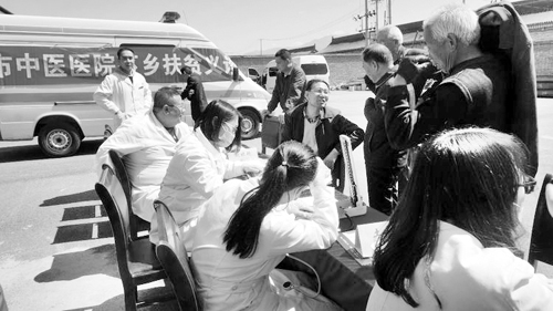 胡家溝村有貧困戶80戶。市委老干部局從2015年開始進行幫扶,緊緊圍繞“一戶一名技術(shù)工,做好精準扶貧”的工作思路,在技能培訓(xùn)、項目實施、基礎(chǔ)建設(shè)、教育援助、文藝活動等方面開展了大量卓有成效的工作,在2016年底取得了整村脫貧的好成績。這次健康扶貧行動,是市委老干部局認真貫徹全市脫貧攻堅大會精神,鞏固成績、持續(xù)發(fā)力,不斷推進幫扶成果的具體體現(xiàn)。針對村民對疾病預(yù)防和治療方面的需求,市委老干部局聯(lián)系市中醫(yī)院組織了義診活動。市中醫(yī)院內(nèi)科、外科、心內(nèi)科等多個科室的9名醫(yī)務(wù)骨干和老專家,為貧困村民把脈問診、開方治療,使106名村民得到診療。