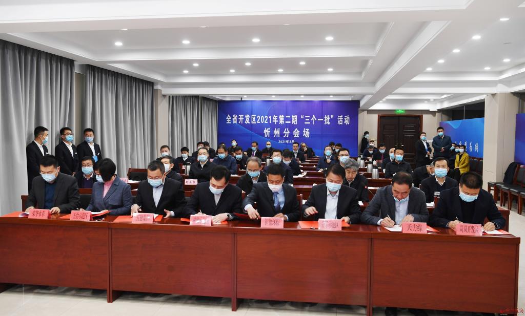 與全省活動(dòng)同步,忻州分會(huì)場(chǎng)舉行了項(xiàng)目集中簽約儀式。在鄭連生、朱曉東等與會(huì)人員的共同見證下,忻州經(jīng)濟(jì)開發(fā)區(qū)新型高端建筑裝飾材料生產(chǎn)及倉(cāng)儲(chǔ)物流基地項(xiàng)目、原平經(jīng)濟(jì)技術(shù)開發(fā)區(qū)年產(chǎn)2.5萬噸建筑配套輔材項(xiàng)目、繁峙經(jīng)濟(jì)技術(shù)開發(fā)區(qū)新建300MW光伏發(fā)電項(xiàng)目、定襄經(jīng)濟(jì)技術(shù)開發(fā)區(qū)基于5G+云平臺(tái)風(fēng)力發(fā)電環(huán)鍛件智能制造擴(kuò)建項(xiàng)目、岢嵐經(jīng)濟(jì)技術(shù)開發(fā)區(qū)玻璃棉生產(chǎn)項(xiàng)目、靜樂現(xiàn)代農(nóng)業(yè)產(chǎn)業(yè)示范區(qū)杜家村鎮(zhèn)集中供熱熱源廠建設(shè)工程特許經(jīng)營(yíng)BOT項(xiàng)目、神池現(xiàn)代農(nóng)業(yè)產(chǎn)業(yè)示范區(qū)基礎(chǔ)設(shè)施及標(biāo)準(zhǔn)廠房建設(shè)PPP項(xiàng)目、五臺(tái)現(xiàn)代農(nóng)業(yè)產(chǎn)業(yè)示范區(qū)臺(tái)黨參種植及加工項(xiàng)目8個(gè)代表性項(xiàng)目分兩批進(jìn)行簽約。