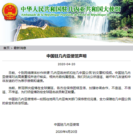 真相:4月20日,中國(guó)駐幾內(nèi)亞使館通過(guò)官方網(wǎng)站發(fā)布聲明表示,使館對(duì)此高度重視并進(jìn)行核實(shí),相關(guān)內(nèi)容純屬捏造。對(duì)此公然造謠、破壞中幾友誼和中非友誼的行為表示憤慨和譴責(zé)。