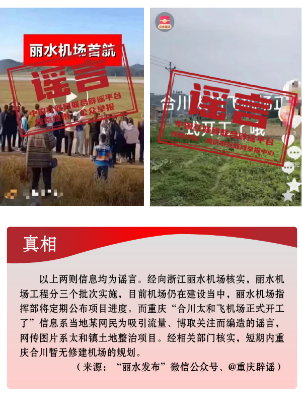 搭蹭熱點(diǎn)散播民生類謠言,渲染焦慮。3月,全國(guó)兩會(huì)召開(kāi),“民生清單”熱度高?!按赫小薄按河巍钡葧r(shí)間節(jié)點(diǎn),有關(guān)招工就業(yè)、疫病傳染等內(nèi)容也成為個(gè)別網(wǎng)民博眼球的素材。一些個(gè)人或自媒體歪曲甚或虛構(gòu)事實(shí),編造散布社會(huì)民生謠言,引發(fā)公眾不必要的焦慮。如,別有用心者惡意虛構(gòu)事實(shí),發(fā)布“重慶80%的工廠暫停招聘”“湖南郴州疫情卷土重來(lái)”等虛假信息,渲染負(fù)面情緒、徒增公眾憂慮、擾亂社會(huì)秩序;還有人為吸引流量、博取關(guān)注,根據(jù)主觀臆想,采取移花接木等手段,散播“京滬高速公路停止收費(fèi)”“浙江麗水機(jī)場(chǎng)已建成投用并首航”“重慶合川太和飛機(jī)場(chǎng)正式開(kāi)建”等涉重大基礎(chǔ)設(shè)施建設(shè)項(xiàng)目的假消息,誤導(dǎo)公眾認(rèn)知,擾亂群眾交通出行秩序。