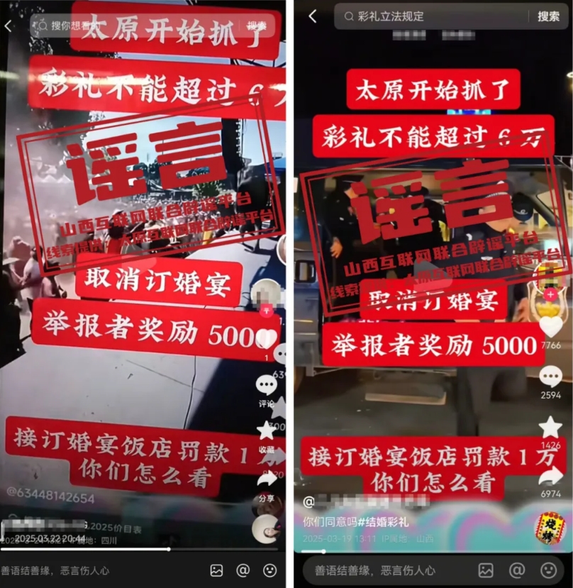 近日,網(wǎng)絡(luò)上流傳“太原彩禮限6萬,違規(guī)者將被罰款甚至拘留”的消息,引發(fā)關(guān)注。經(jīng)屬地相關(guān)部門調(diào)查核實,以上為不實信息,并無任何官方文件或政策依據(jù)。太原互聯(lián)網(wǎng)聯(lián)合辟謠平臺已發(fā)布相關(guān)辟謠信息,望廣大網(wǎng)民不聽、不信、不傳。