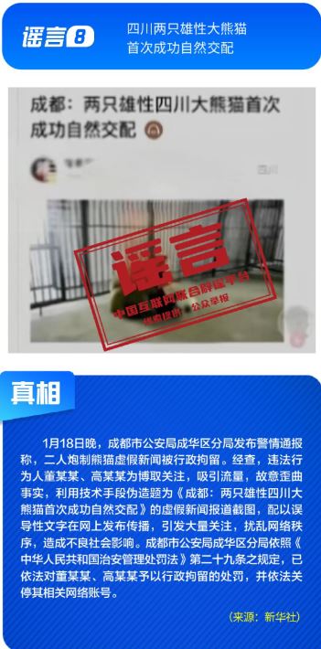 ??針對各類網(wǎng)絡(luò)謠言與亂象,多部門開展協(xié)同治理,聯(lián)動整治。1月16日,中央網(wǎng)信辦召開全國網(wǎng)絡(luò)辟謠聯(lián)動機(jī)制第三次全體會議,部署以辟謠工作新成效助力清朗網(wǎng)絡(luò)空間建設(shè)。中央網(wǎng)信辦聯(lián)合工業(yè)和信息化部等部門持續(xù)整治汽車行業(yè)網(wǎng)絡(luò)亂象,處置一批涉嫌挑動對立、炒作負(fù)面話題、違規(guī)測評的賬號;國家廣播電視總局開展“AI魔改”視頻專項(xiàng)治理,各平臺處置大量違規(guī)內(nèi)容。各地網(wǎng)信部門積極行動,陜西西安深入開展房地產(chǎn)領(lǐng)域網(wǎng)絡(luò)專項(xiàng)行動,處置散布樓市謠言的房產(chǎn)中介賬號,四川成都依法處置30余個惡意關(guān)聯(lián)地域、污名化城市的違規(guī)賬號。公安機(jī)關(guān)依法打擊造謠傳謠人員。擺拍“小女孩在學(xué)校跳蚤市場用50元淘到名酒”、利用AI偽造“假救護(hù)車非法轉(zhuǎn)運(yùn)”、編造“兩只雄性四川大熊貓首次成功自然交配”等謠言的相關(guān)責(zé)任人已依法被予以行政處罰。