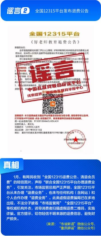 ??公共政策領(lǐng)域謠言誤導(dǎo)公眾決策?!吧绫?]有有效期限制、未到期不能換新卡”是對社??ü芾碚叩恼`讀,給民眾平添困擾;“28家博物館元旦期間閉館”實(shí)為少數(shù)博物館根據(jù)運(yùn)營安排所做的微調(diào),網(wǎng)帖嚴(yán)重夸大實(shí)際閉館情況,引發(fā)負(fù)面炒作;“深圳有望推行12年義務(wù)教育,高中免費(fèi)”是對現(xiàn)行政策的“超前編造”,誤導(dǎo)學(xué)生及家長群體;“全國12315平臺發(fā)布退費(fèi)公告”,則是假冒監(jiān)管機(jī)構(gòu)名義散播不實(shí)通知,為后續(xù)詐騙行為做鋪墊。