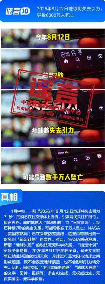 ??健康與科普領(lǐng)域謠言違背客觀規(guī)律?!叭搜椎鞍资恰黾用庖吡Α姆▽殹笨桃饪浯笤撎幏剿幍呐R床用途,忽略其特定醫(yī)療場景與使用風(fēng)險(xiǎn);所謂“大棚草莓、冷庫葡萄、進(jìn)口車?yán)遄?、染色砂糖橘是冬天水果界四大毒王”謠言片面解讀農(nóng)產(chǎn)品種植與保鮮方式,缺乏科學(xué)依據(jù);“四川兩只雄性大熊貓首次成功自然交配”純屬為吸引流量而捏造的獵奇內(nèi)容,其視頻畫面為AI生成;“2026年8月12日地球?qū)⑹ヒΓ瑢?dǎo)致6000萬人死亡”更是無中生有的荒謬謠言。