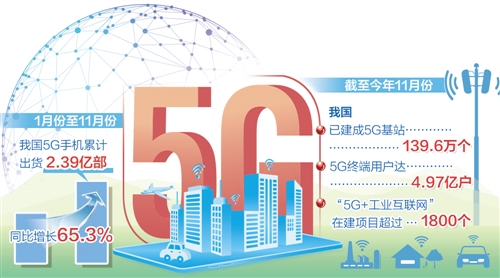 我國5G網絡建設和應用正加速推進。截至今年11月份,已建成5G基站139.6萬個,5G終端用戶達到4.97億戶,“5G+工業(yè)互聯網”在建項目超過1800個。
