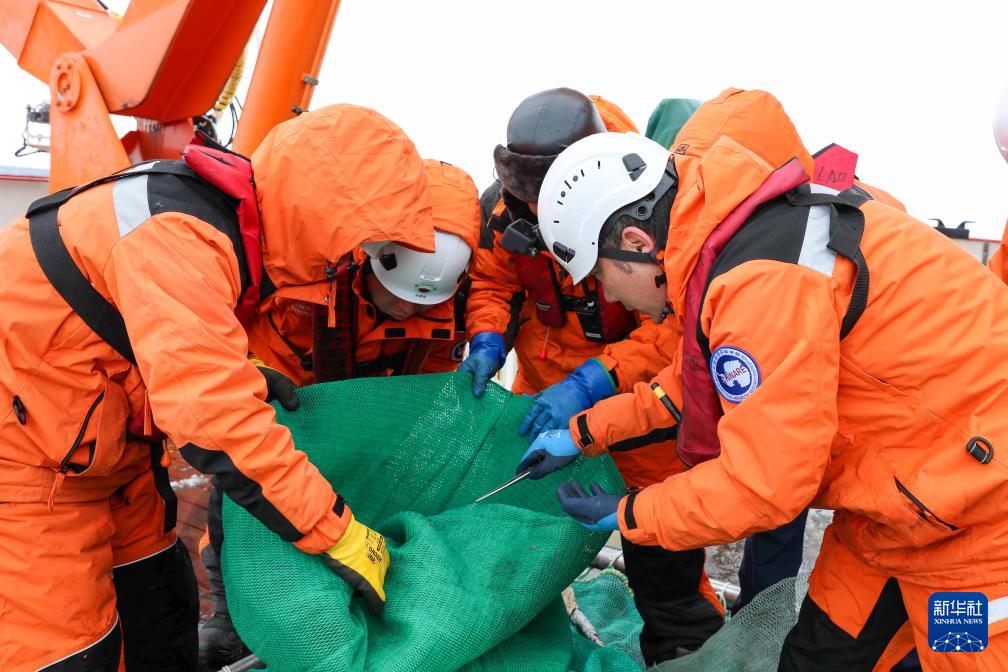 北京時(shí)間2024年1月5日凌晨,在“雪龍2”號艉甲板,中國第40次南極考察隊(duì)開始了抵達(dá)阿蒙森海后的首次考察作業(yè)。新華社記者 周圓 攝