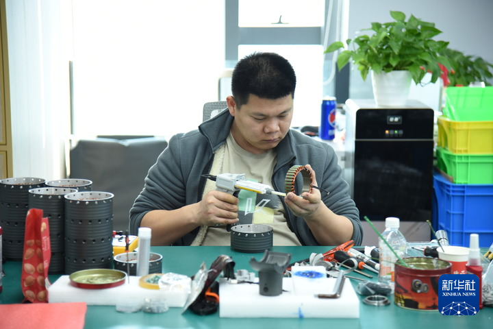 在深圳市眾擎機器人科技有限公司,一位工作人員正調試人形機器人部件(1月21日攝)。新華社記者洪澤華攝
