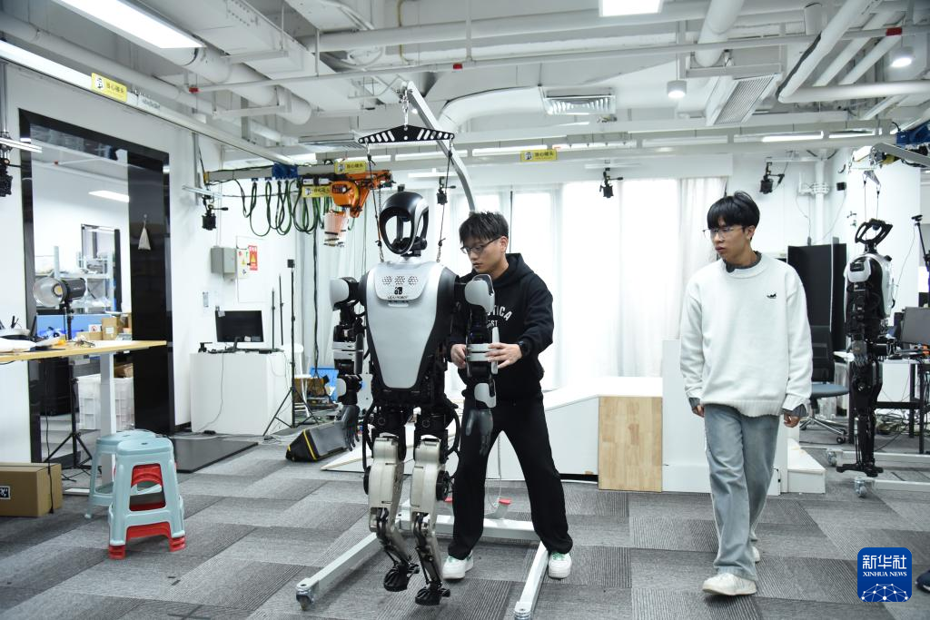 樂聚(深圳)機器人技術有限公司的兩名工作人員正在調試一臺“夸父”人形機器人(1月21日攝)。新華社記者洪澤華攝