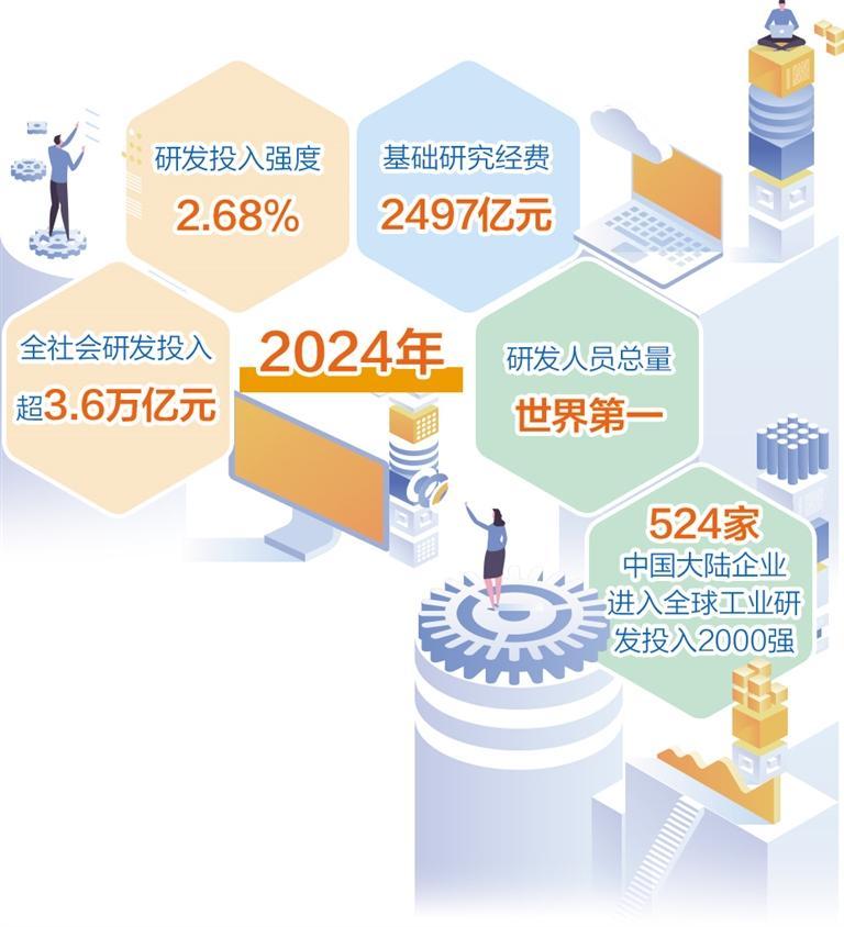 科技投入持續(xù)增加。2024年全社會研發(fā)投入超3.6萬億元,較2020年增長48%;研發(fā)投入強度達2.68%,超過歐盟國家平均水平;研發(fā)人員總量世界第一。基礎(chǔ)研究經(jīng)費達2497億元,較2020年增長超過70%,在量子科技、生命科學(xué)、物質(zhì)科學(xué)、空間科學(xué)等領(lǐng)域取得一批重大原創(chuàng)性成果,高水平國際期刊論文數(shù)量和國際專利申請量連續(xù)5年世界第一。