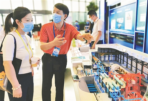 國家電投集團(tuán)的專家在模型前向參觀者介紹國家科技重大專項(xiàng)成果——國和一號(hào)(CAP1400)壓水堆核電站。經(jīng)濟(jì)日報(bào)記者 佘惠敏攝