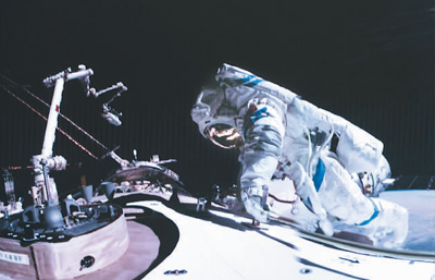 12月21日在北京航天飛行控制中心拍攝的神舟十七號(hào)航天員唐勝杰開(kāi)展艙外操作的畫(huà)面。韓啟揚(yáng)攝(新華社發(fā))
