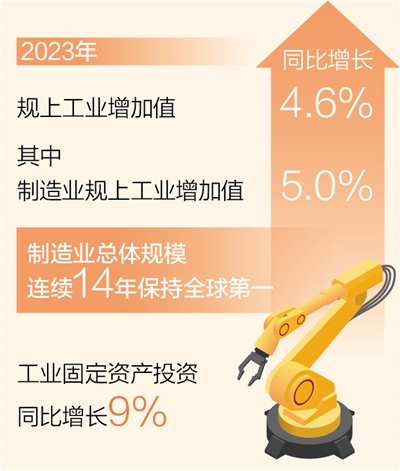 記者日前從工業(yè)和信息化部獲悉:2023年,全年規(guī)模以上工業(yè)增加值同比增長(zhǎng)4.6%,較2022年提升1個(gè)百分點(diǎn),其中制造業(yè)規(guī)模以上工業(yè)增加值同比增長(zhǎng)5.0%,我國(guó)制造業(yè)總體規(guī)模連續(xù)14年保持全球第一。