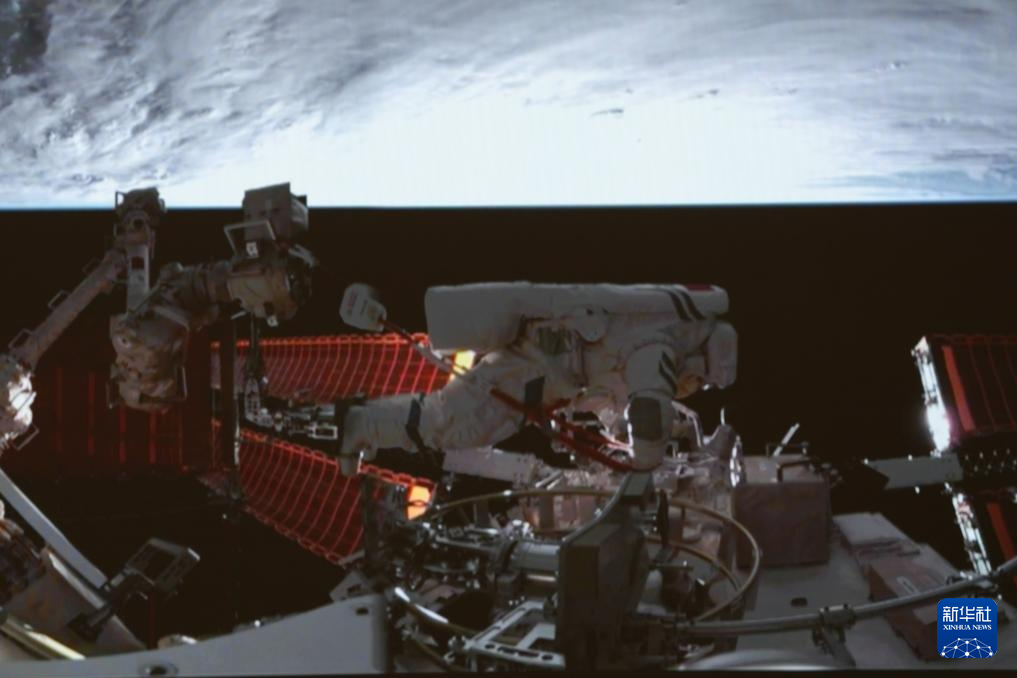 1月20日在北京航天飛行控制中心拍攝的神舟十九號航天員宋令東在空間站組合體艙外工作的畫面。新華社記者 劉芳 攝