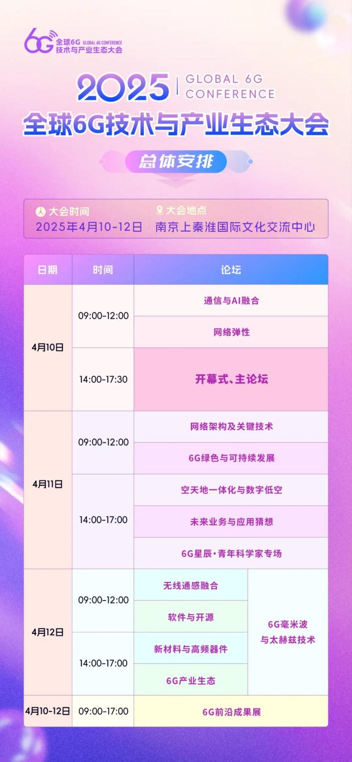 4月10日至12日,由未來移動通信論壇、紫金山實驗室主辦的2025全球6G技術(shù)與產(chǎn)業(yè)生態(tài)大會(原全球6G技術(shù)大會)將在南京上秦淮國際文化交流中心召開。本次大會以“共筑創(chuàng)新 同享未來”為主題,來自全球的6G領(lǐng)域的思想領(lǐng)袖、技術(shù)先鋒和產(chǎn)業(yè)領(lǐng)軍人物將再次齊聚金陵,共同探討6G技術(shù)創(chuàng)新與未來產(chǎn)業(yè)生態(tài)的發(fā)展藍(lán)圖。