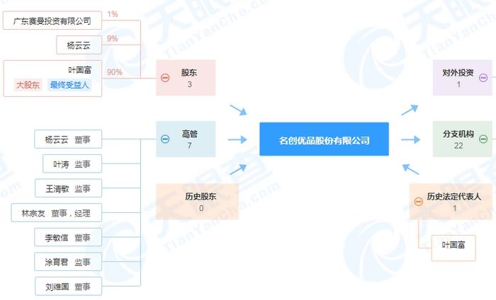 曾經(jīng)的“哎呀呀”已經(jīng)成了時代的眼淚,但在2013年,一個更強的名創(chuàng)優(yōu)品誕生了。天眼查顯示,名創(chuàng)優(yōu)品股份有限公司(簡稱“名創(chuàng)優(yōu)品”)的曾用名是哎呀呀飾品連鎖股份有限公司(簡稱“哎呀呀”),大股東、最終受益人是葉國富,其持股比例高達90%。