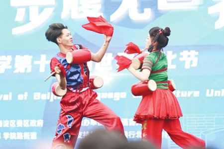 當(dāng)日活動(dòng)吸引了來自世界各地的3萬余名師生及社會(huì)各界人士。獨(dú)唱《人說山西好風(fēng)光》《千年一塔》,舞蹈《醋之韻》《翼城花鼓》等贏得師生們熱烈掌聲。在五大洲文化展區(qū),絳州木版年畫傳承人吳百鎖現(xiàn)場(chǎng)印制木版年畫贈(zèng)送師生,成為一道亮麗風(fēng)景。廣靈剪紙、應(yīng)縣木塔模型、黎侯虎、寧武毛健茶等吸引各國留學(xué)生駐足欣賞。“華夏古文明山西好風(fēng)光”主題相框前,無數(shù)外國友人饒有興趣交流互動(dòng),拍照留念?!吧轿髟亍被鸨本┱Z言大學(xué)世界文化節(jié)。