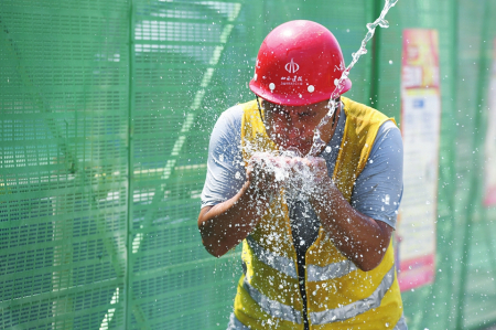 當(dāng)日,是入伏第一天,意味著開始進(jìn)入一年中最熱的時(shí)候。在熱火朝天的施工現(xiàn)場,工人師傅們埋頭苦干,他們雖然戴著自制遮陽帽、冰袖,身旁放著水壺,但一小會(huì)兒工夫就會(huì)汗流浹背?!斑@樣的杯子,我每天要喝好幾杯水。”天氣太熱,來自四川樂山的林英把杯子里的水一飲而盡。黝黑的皮膚、如雨的汗水、潮濕的后背……當(dāng)大多數(shù)人避暑納涼時(shí),不少勞動(dòng)者卻辛勤地?fù)]灑著汗水,堅(jiān)守在施工一線。在這個(gè)工地上,有很多和林英一樣的打工人,他們來自全國各地,用青春和汗水建設(shè)美麗山西。