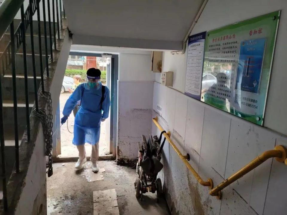 “益行志愿服務(wù)隊從8月4日17點下班后開始組織救災(zāi)工作,到凌晨24點充分準(zhǔn)備完畢。總計出動9輛汽車,志愿者們對社區(qū)內(nèi)的一樓單元門口、垃圾分類驛站、居民家里、黨群活動中心、居委會物資庫、社區(qū)花園內(nèi)和道路,開展清理淤泥和清洗路面工作?!睆垈惤榻B道。