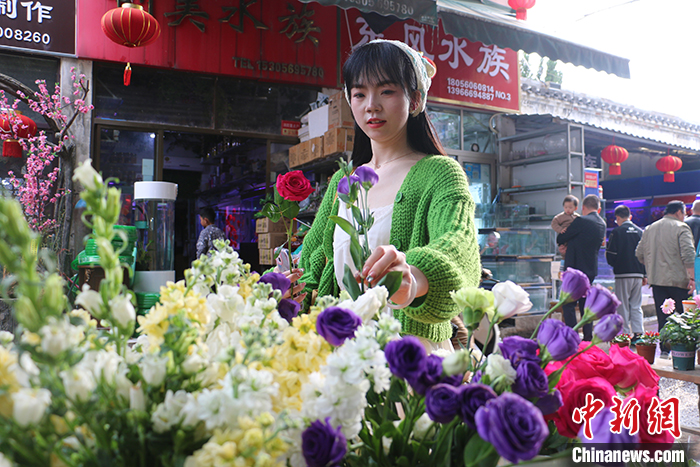 3月23日,安徽省合肥市裕豐花鳥魚蟲市場,“Z世代”女孩詹銀銀正在挑選鮮花,準備擺攤銷售。隨著氣溫回升,鮮花市場迎來一波熱度。記者近日在采訪中了解到,中國年輕人正在通過各種鮮花消費場景把春天“帶回家”,鮮花消費已突破固有的節(jié)日專屬儀式感,成為年輕人日?!皭偧骸钡闹匾绞健V行律缬浾?張強 攝