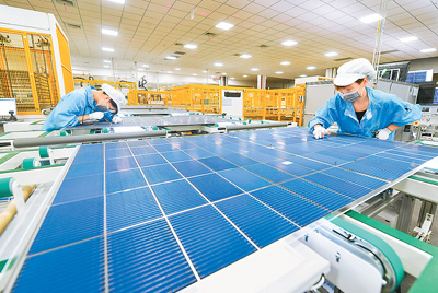 圖為安徽華晟新能源科技股份有限公司的異質(zhì)結(jié)光伏電池及組件工廠內(nèi),技術(shù)人員在對(duì)產(chǎn)品進(jìn)行檢測(cè)。徐 勇攝(新華社發(fā))