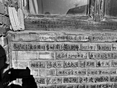 2024年春天,78歲的張福青過(guò)世了。那時(shí),環(huán)游中國(guó)的攝影師蔡山海,路過(guò)代縣上高陵村,恰巧碰上從外地趕回老家的張宏剛、張宏英為剛過(guò)世的父親舉行葬禮。他被葬禮上的鑼鼓聲吸引,走進(jìn)院子時(shí),卻被寫(xiě)滿院子的文字震撼到。隨后,蔡山海用相機(jī)拍下那些寫(xiě)在紅磚墻、木門(mén)窗上的文字,并發(fā)在“小紅書(shū)”上,隨即走紅網(wǎng)絡(luò)。