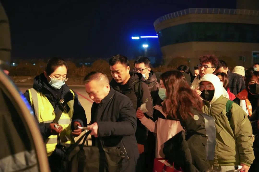 為了早點(diǎn)回家,旅客們披星戴月,趕最早的航班。太原機(jī)場(chǎng)地服人員更是早早守候在停機(jī)坪,幫旅客檢票登機(jī)。