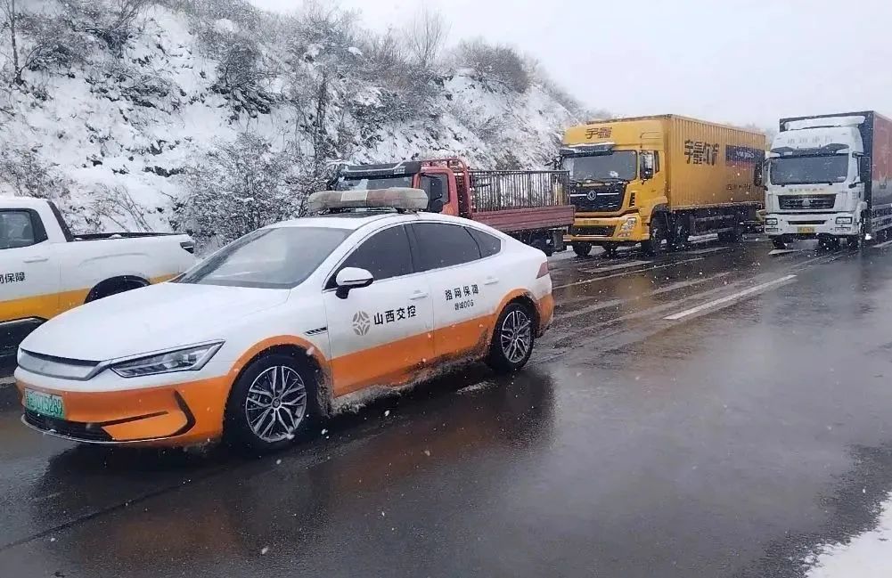 降雪過后,高速路上路面濕滑,山西高速交警和交控集團(tuán)人員為乘客開道,一路護(hù)送,保障旅客平安回家。