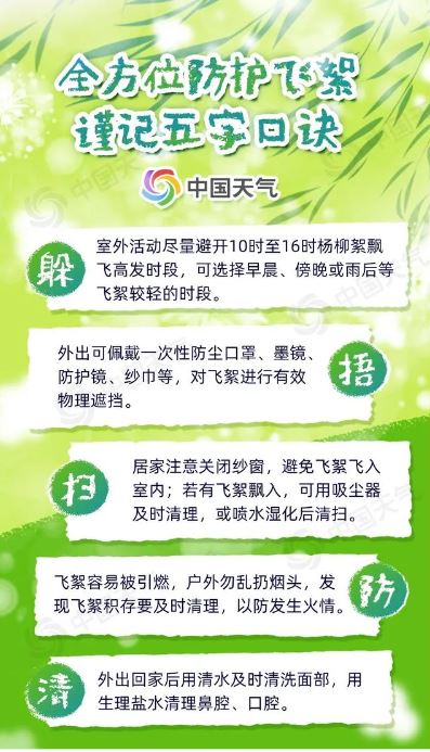 隨風飄散的飛絮可能會攜帶花粉、粉塵等物質入侵人體呼吸道,引發(fā)皮膚或呼吸系統(tǒng)的過敏癥狀,且楊柳絮屬于易燃物,遇到明火會迅速燃燒蔓延,甚至引燃其他可燃物,釀成火災。記住五字口訣,全方位防護擾人的“四月雪”。