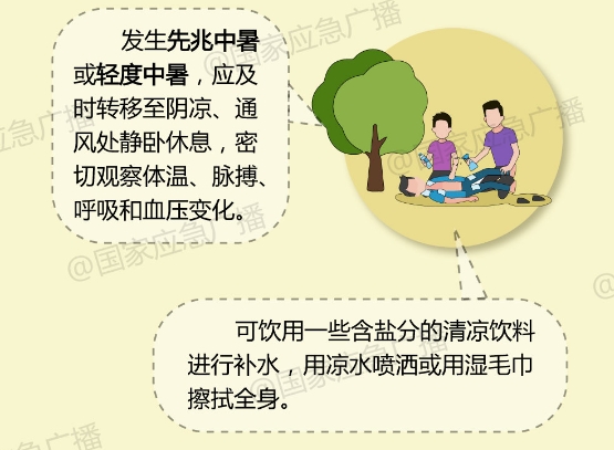 使中暑者在陰涼通風(fēng)處平臥,抬高下肢,及時快速降溫、補糖鹽水,謹(jǐn)防低血壓,保證重要臟器血供,盡快送醫(yī)。