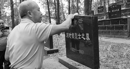 3.烈士侄兒劉正業(yè)擦拭墓碑。