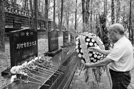長子獨立團團長劉時智烈士的墓碑前,來自湖北省紅安縣華河鎮(zhèn)大學村的劉正業(yè)捧著從家鄉(xiāng)帶來的水和土,淚流滿面,反復說著“侄子不孝,現(xiàn)在才找到您,這么晚才來看您?!?/p>