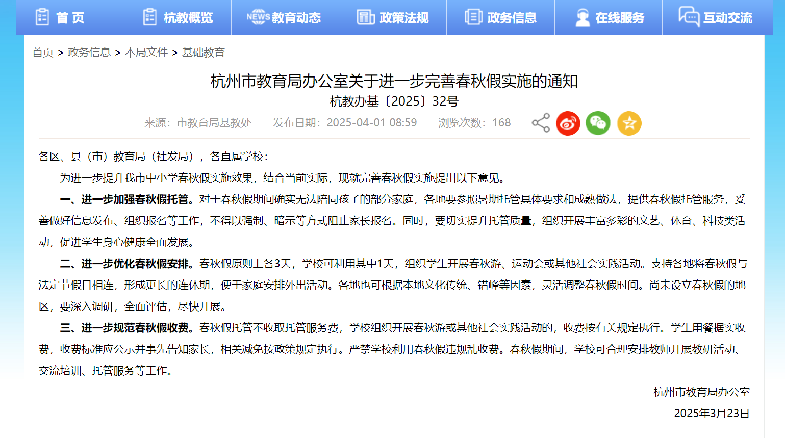 ▲杭州市教育局明確要求春秋假托管不收取托管服務費