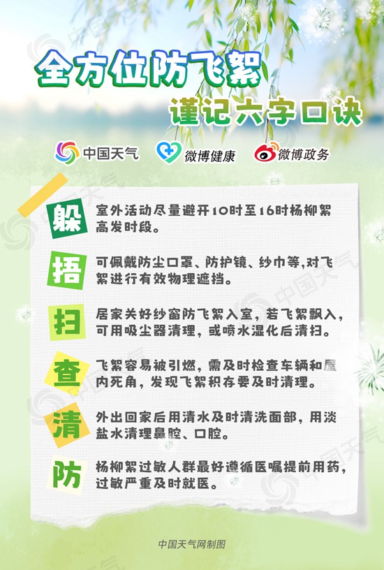 京津冀楊柳絮飄飛可持續(xù)至5月,飛絮中或攜帶花粉、灰塵等多種過敏原,被人體吸入后,易引發(fā)過敏性鼻炎、哮喘等疾病。飛絮如何防?如何降低過敏風險?中國天氣網(wǎng)總結(jié)了躲、捂、掃、查、清、防6字口訣,助你全方位防護飛絮。