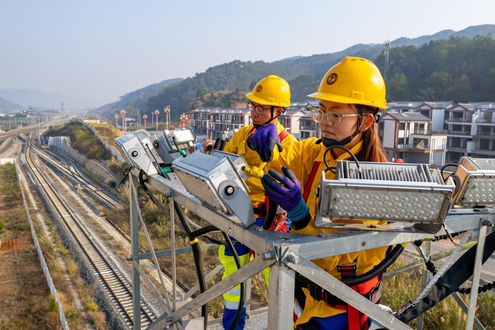 3月7日,中國鐵路昆明局集團有限公司“00后”女電工王華欽(右一)在中老鐵路寧洱站貨運場檢修燈塔(無人機照片)。新華社發(fā)(殷學(xué)合 攝)
