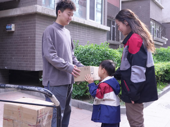 母子倆戴上頭盔,奔赴第一個(gè)派送點(diǎn)。到達(dá)小區(qū)后,面對(duì)要送2件、取1件的任務(wù),辰辰興奮地自告奮勇抱起快遞跑進(jìn)樓道,卻很快被現(xiàn)實(shí)“上了一課”——沒有電梯,收件人住在5層。當(dāng)他送完這家,額頭滿是汗水,步伐也明顯跟不上媽媽了。出了小區(qū),辰辰一句“真累呀,還有那么多,得送到啥時(shí)候啊”,道出了孩子對(duì)媽媽工作艱辛的初步體會(huì)。而閆詩(shī)琪輕撫兒子頭說道,“孩子,干啥工作也要有耐心?!辈粌H是對(duì)兒子的鼓勵(lì),更是她日常工作的真實(shí)寫照。
