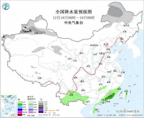12月18日08時至19日08時,內蒙古東北部、黑龍江中北部、新疆北部和南疆西部山區(qū)、甘肅河西等地部分地區(qū)有小到中雪或雨夾雪,其中,新疆沿天山地區(qū)和伊犁河谷局地有大到暴雪(10~16毫米)。湖南南部、福建東部和南部、西南地區(qū)南部、廣西西南部、廣東東部和南部、海南島東部、臺灣島東部等地部分地區(qū)有小到中雨,其中,廣東東部局地有大雨(25~35毫米)。遼寧東部、西藏中北部等地部分地區(qū)有4~6級風;臺灣海峽、巴士海峽、南海東北部和中東部海域將有5~7級大風、陣風8級。